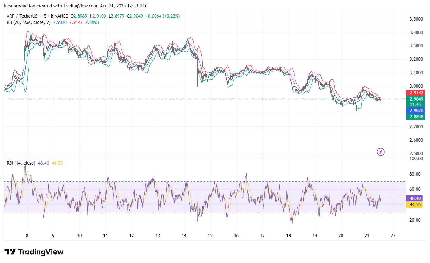 XRP came off highs near $3.66 but has slipped below a critical support band at roughly $2.96-$3.00. This breakdown increases the chance of a deeper dip potentially toward the early August low near $2.73 or even the May peak at $2.65. The token is trying to stabilize around its 55-day simple moving average at roughly $2.90. Despite the pullback, medium-term uptrend holds if key lows prevent further slide. Institutional volume remains strong though profit-taking pressures triggered a four-session decline.